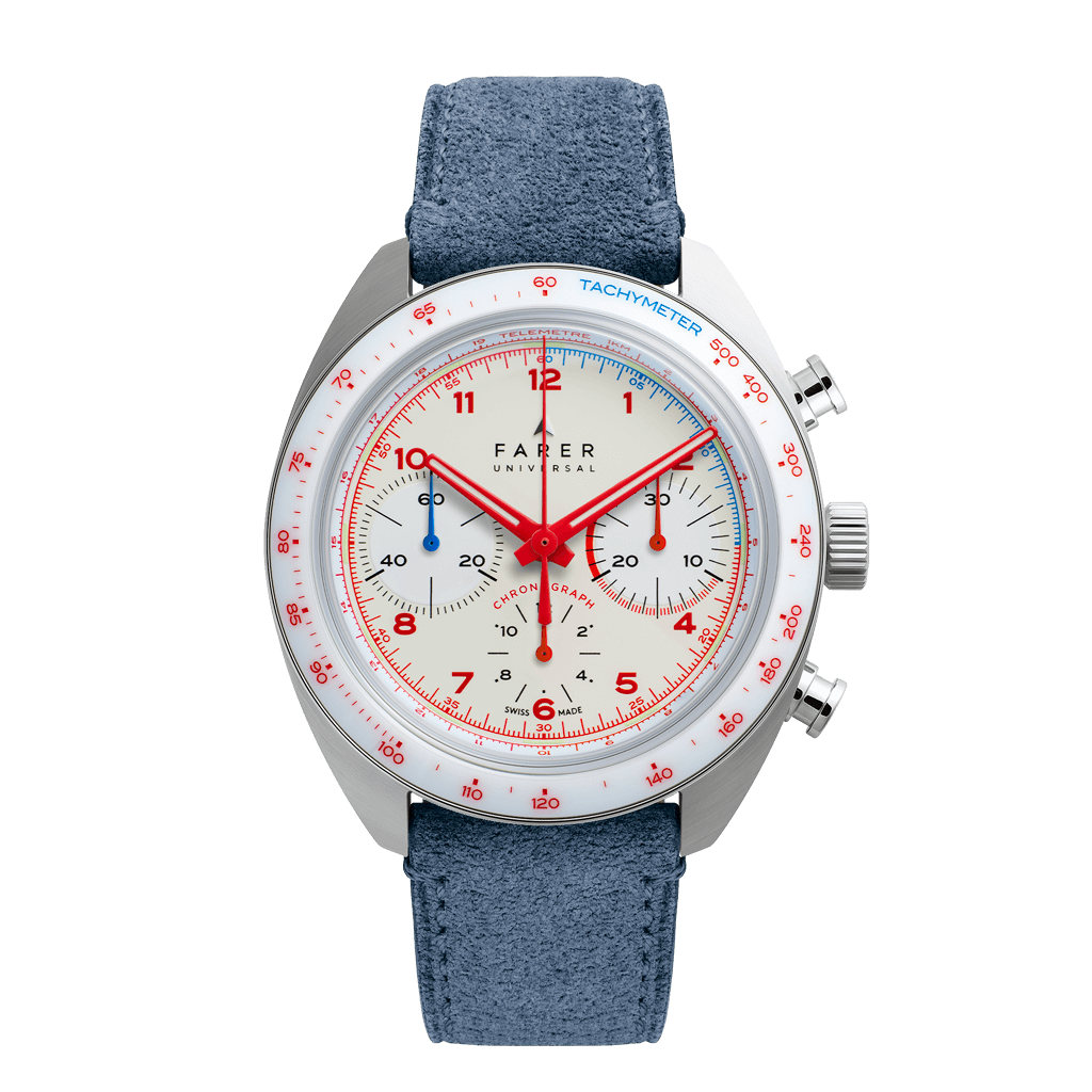 Matte off-white main dial with brilliant white embossed twin sub-dials. Racing red, brilliant blue and jet black markings, dashed hour markings of Super-LumiNova, raised red multi-overprinted hour numerals, internal telemetry scale