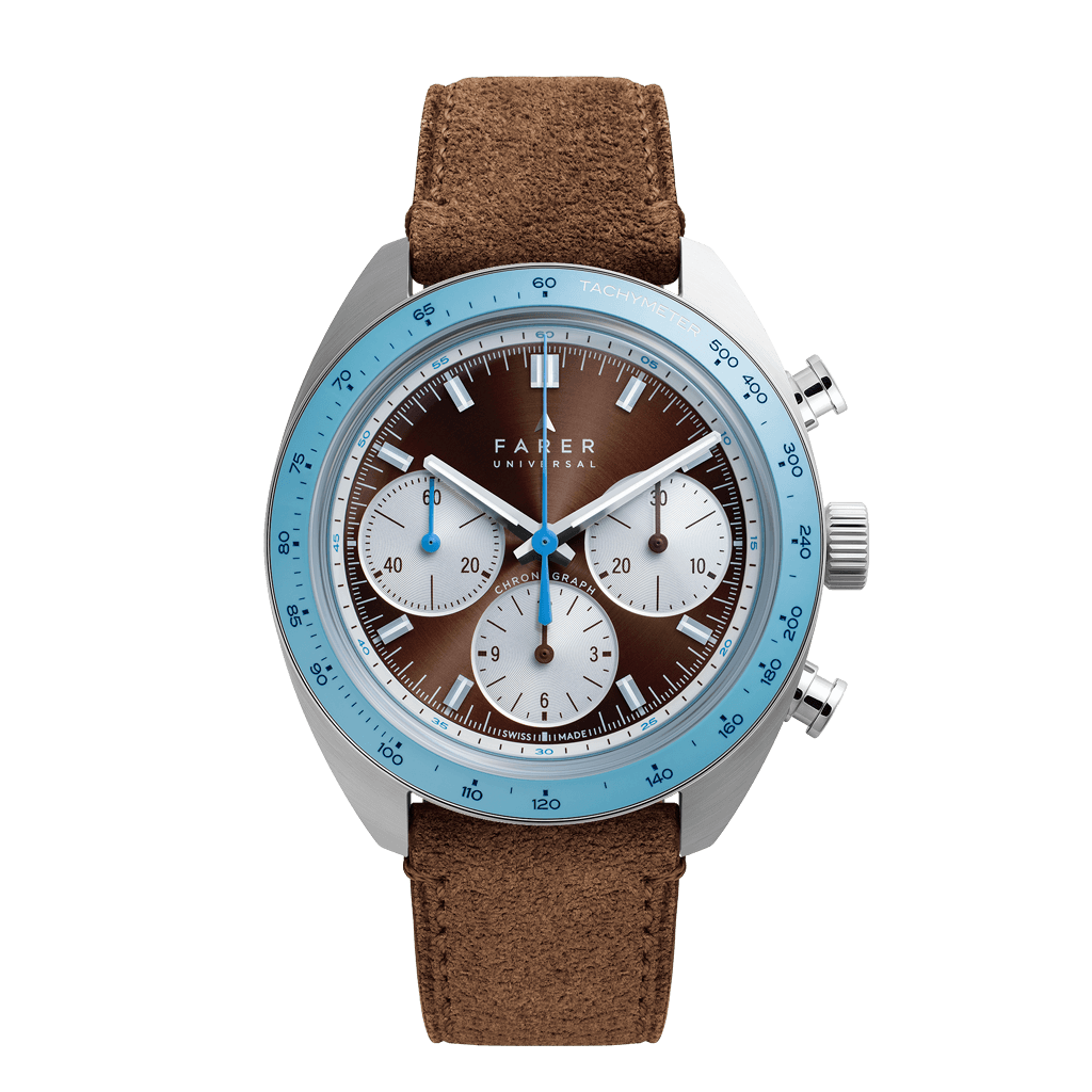 Polished baton hour and minute hands, filled with Super-LumiNova. Blue running chronograph hand, chocolate brown chronograph sub-dial hands, blue running seconds sub-dial hand.