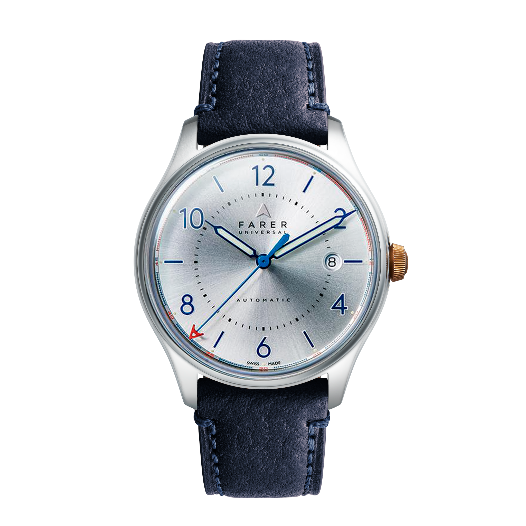 The sharp design of the Endurance II watch is built on the silver sunray vintage curved dial with blue and red accents. The numerals are overprinted 10 times to create a detailed depth and subtle domed effect on close inspection, outlined by a microfine key line of pure white. The surrounding split track design has been stylised with Super Lumi-Nova hour dot markers that link to the in-fill of the Farer syringe-style hour and minute hands.
