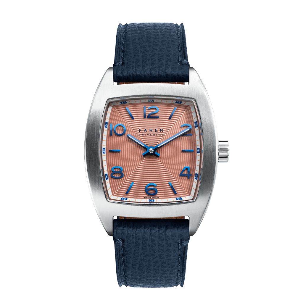 The New York brings the ever-popular pairing of a bright copper dial and polished blue markers to the Tonneau collection. However, the New York takes this combination to new heights with a daring use of textures and finishes to produce a truly captivating dial. The main dial itself features a pattern of concentric ridges that produce a range of highlights and shadows that give it some real depth. Meanwhile, along the outer edge is a white minute track. The hash marks are in salmon pink to match the copper, whilst the five-minute marks are in blue to mirror the hands and markers. Speaking of the applied markers, they alternate between Arabic numerals and simple batons, all of which are polished and have a rich blue colour. These have a rounded top so that they catch the light from every angle, and they’re paired with a clean polished baton handset. It is thanks to this pairing of dark blue hands and numerals against a light metallic dial that the New York is as legible as it is stunning.