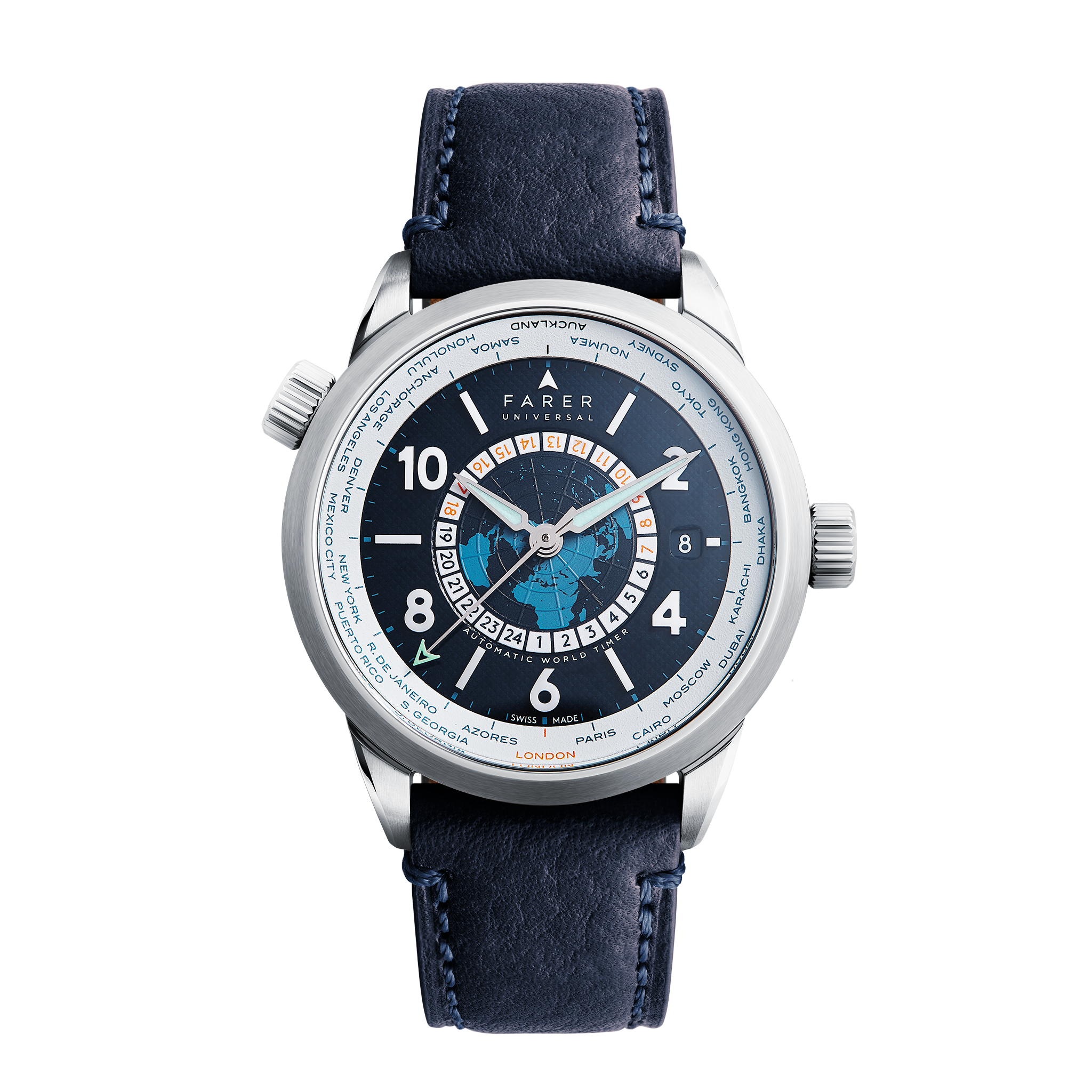 The Farer World Timer 39mm case is a slick fit on any wrist, crafted from 316L stainless steel and with a case profile of just 11mm. The top domed sapphire crystal with internal anti-reflective treatment is held by an outer brushed bezel, fitted to the highly-polished case with outline edges and micro-blasted side cut-ins that follow the shape of the dropped lugs. A distinctive case design with dual crowns, the main crown (controlling time, date and universal 24-hour disk) is finished in solid stainless steel and inset with our trademark Farer bronze detail. Whereas the offset crown is formed of solid stainless steel and features the embossed World Timer marque (controlling the inner bezel to set the 24 time zones).